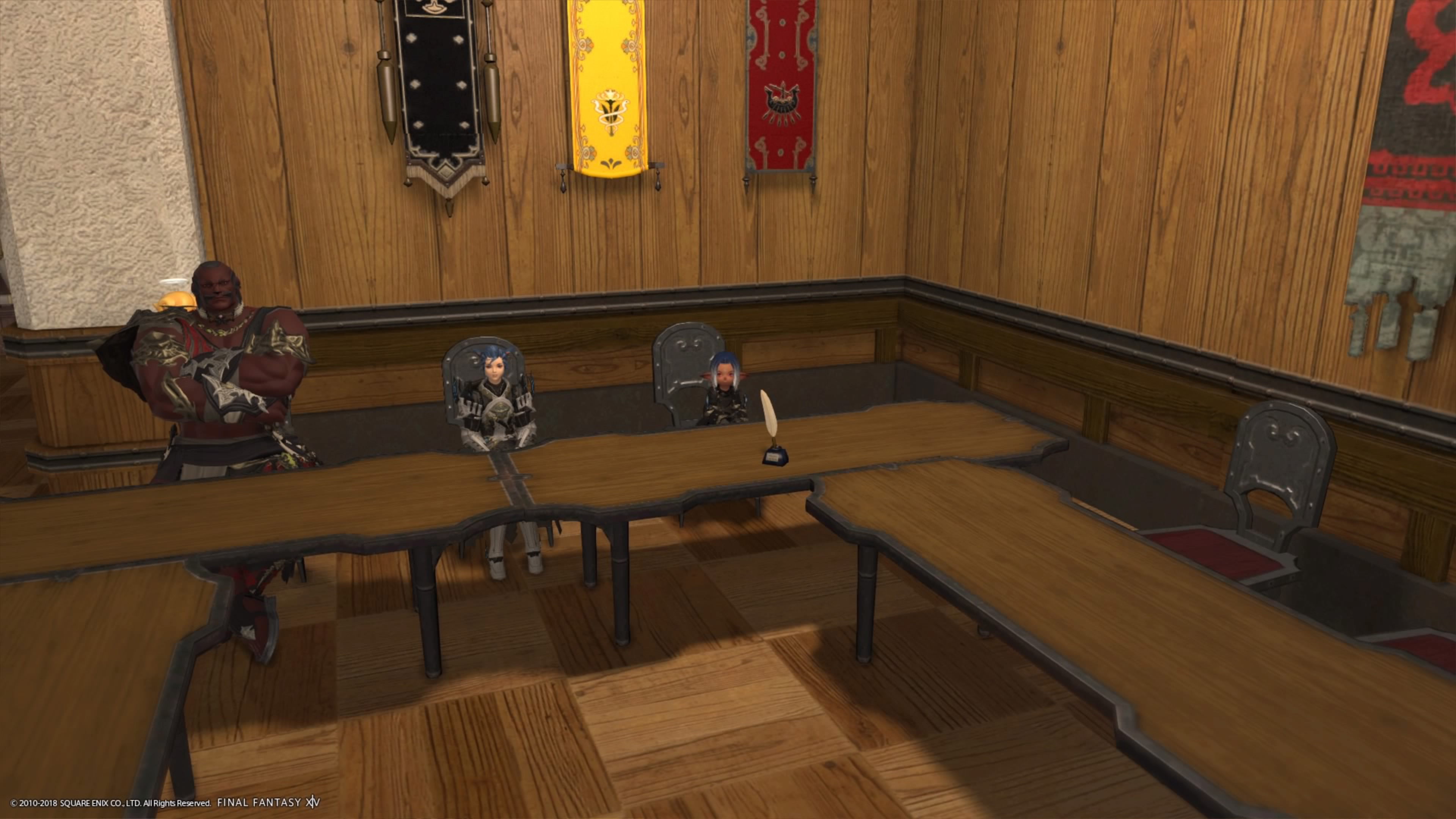 What we have completed so far on the main floor is the Merchant and storage area on the right, along with the living room. Work is being done on the music hall still. In the basement there is our hot tub, and a small kitchen area. Finally upstairs to the right is the Burgermeister's office and the board room. Below is a picture of our current Burgermeister and two Marquois. (From left to right, Hadeus, Anathania, and Aliron)